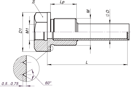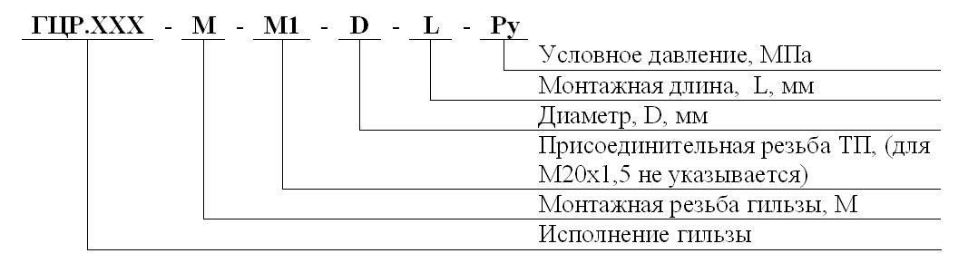 Гильза ГЦР.123-М33х2-20-250-25 – гильза цилиндрическая резьбовая, конструктивное исполнение 123, с монтажной резьбой М33х2, диаметр 20 мм, монтажная длина 250 мм, рассчитана на условное давление 25 МПа;
